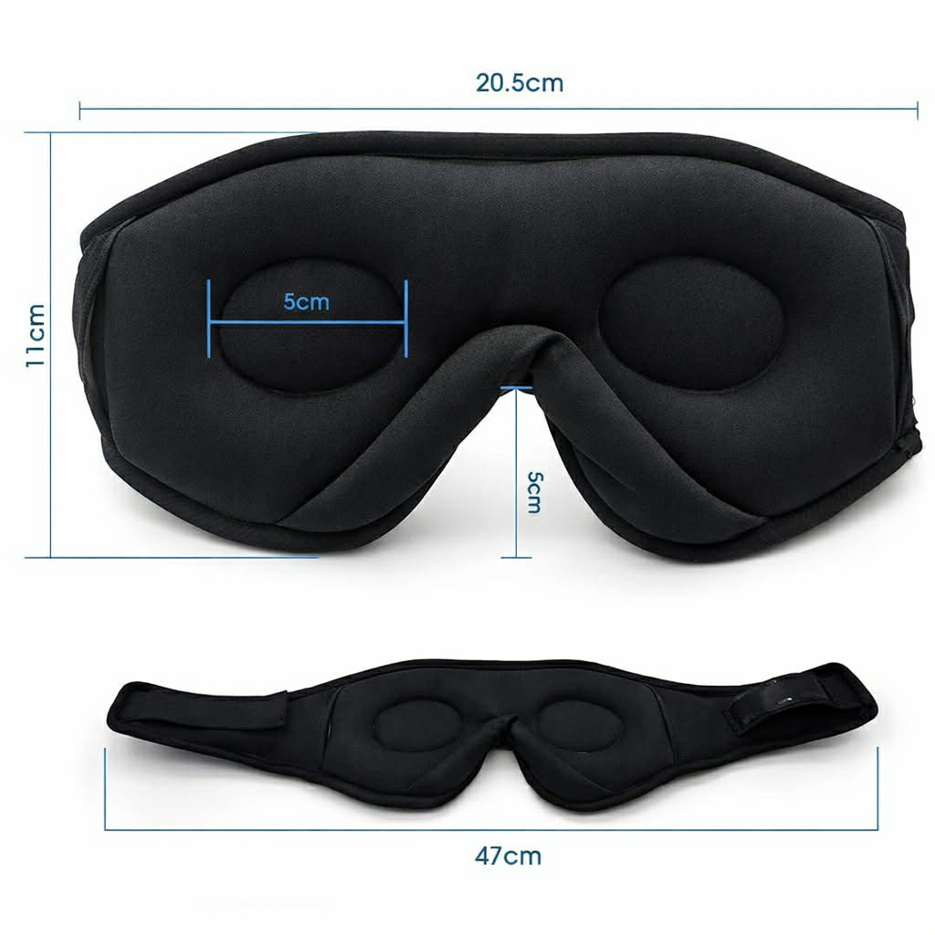 Bloquea hasta el 99% de la luz, Su estructura con espacio 3D para los ojos evita el contacto directo con pรกrpados y pestaรฑas . La correa ajustable de velcro se adapta a la forma de tu cabeza sin apretar . ย